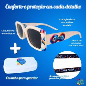 O grande destaque está nas lentes polarizadas com 100% de proteção contra os raios UV, que atuam diretamente na diminuição do impacto da luz solar e do reflexo nos olhos. Isso significa mais nitidez, menos cansaço visual e maior conforto para crianças com hipersensibilidade à luz, algo muito comum entre autistas. Com esses óculos, passeios ao ar livre, idas à escola, terapias ou qualquer atividade externa se tornam muito mais agradáveis e seguras.