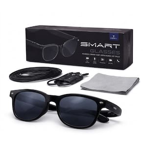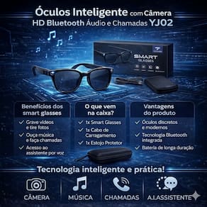Óculos inteligentes com câmera HD, conexão Bluetooth para áudio e chamadas, microfone embutido, bateria recarregável, design moderno, leve e confortável.Vendido por Espaço & Inspiração e entregue por Casas Bahia