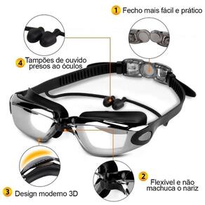 Este óculos também conta com um protetor auricular integrado, oferece proteção completa dentro da água, evitando a entrada de água não apenas nos olhos, mas também nos ouvidos.