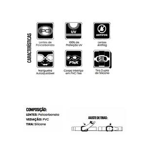 Composição: Lentes 100% Policarbonato; Tiras 100% Silicone; Vedação 100% PVC;
