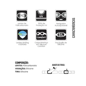 Composição: Lentes 100% Policarbonato; Tiras 100% Silicone; Vedação 100% Silicone;