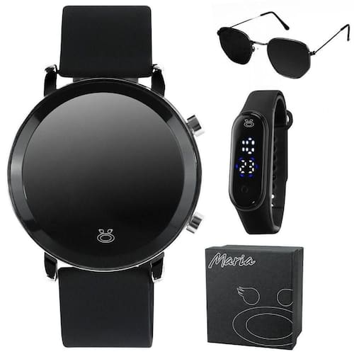Oculos Protecao Uv + Relogio Digital Aço Inox Redondo Preto Pulseira Ajustavel Casual Silicone Kit Orizom Maria - Relógios Digitais e Óculos de Sol Hexagonal Chegou o kit perfeito para quem busca estilo e sofisticação! Este incrível kit inclui dois elegantes relógios digitais Orizom Maria, ambos com pulseiras de silicone ajustáveis para um ajuste perfeito. Além disso, você receberá um moderno par de óculos de sol com formato hexagonal que oferece proteção UV para os seus olhos.