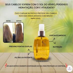 Utilize o óleo capilar nutritivo antes e durante a exposição ao sol para garantir uma proteção contínua dos fios contra os raios uv.