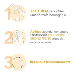 Ele pode ser aplicado sobre a pele úmida ou seca, é resistente à água e oferece muito boa tolerância, além de ser testado sob supervisão dermatológica. Photoderm Eau Solaire Bronz está disponível em embalagem com 200ml.