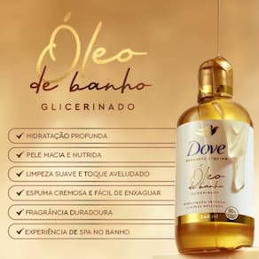 • O Dove Óleo de Banho Glicerinado possui fórmula com 96% dos ingredientes de origem natural, que renovam e nutrem a pele