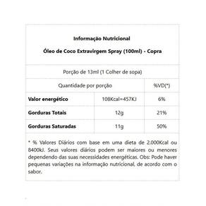 Óleo De Coco Extravirgem Spray (100ml) - Padrão: único Óleo de Coco Extravirgem Spray (100ml) - Copra Exclusivo para uso culinário, o Óleo de Coco Extravirgem Spray da Copra agiliza e facilita sua experiência na cozinha. Elaborado com óleo de coco, é prático para untar panelas, assadeiras, formas e máquina de waffle, além de grelhar, fritar e saltear alimentos? Você escolhe a quantidade exata para cada preparo com algumas borrifadas. Cada borrifada de 1 segundo libera cerca de 1ml do produto. Outra particularidade, é que ele contém aspersor para promover a sua pulverização, sendo ideal para finalizar diversos preparos culinários. É um produto sem glúten, 0% gordura trans e resistente à altas temperaturas. E o melhor: tem sabor neutro. Benefícios:* 0% Gorduras Trans;* É pratico;* Sem Sabor;* Acidez Máxima 0,3%;* Sem Glúten;* Produto Vegano.