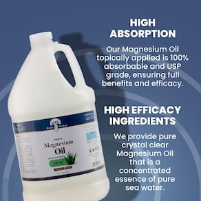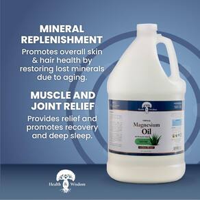 Uma imersão de 20 a 30 minutos de óleo de magnésio da Health and Wisdom começará a fornecer magnésio a cada célula do corpo instantaneamente. Disponível em tampa flip top de 59 ml, 113 g (com pulverizador opcional) ou ponta conta-gotas de 113 g para distribuir uma gota de cada vez, 340 g (com pulverizador opcional), 473 ml (com pulverizador opcional), 1,8 l (com dispensador de bomba opcional) e 1 galão (com dispensador de bomba opcional). Nosso óleo de magnésio com Aloe Vera contém 2387 mg de magnésio elementar por onça ou 404 mg por colher de chá.