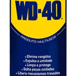O óleo lubrificante desengripante multiuso WD-40 elimina rangidos, expulsa a umidade, limpa e protege, solta peças oxidadas e libera mecanismos travados.
