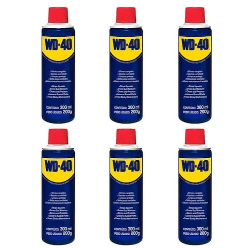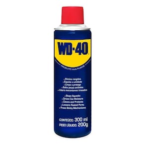 O óleo lubrificante desengripante multiuso WD-40 elimina rangidos, expulsa a umidade, limpa e protege, solta peças oxidadas e libera mecanismos travados.