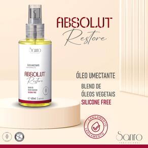 Óleo Absolut Restore nutre as camadas mais profundas da fibra capilar. Sua formula contém Blend de óleos vegetais como: óleo de linhaça, abacate, uva, argan e coco. Umectação intensiva para cabelos secos desnutridos, crespos ou cacheados.