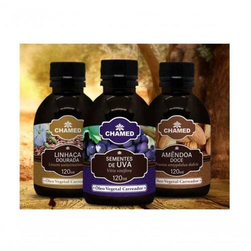 Kit Óleo Vegetal de Amêndoa Doce + Semente de Uva + Linhaça Dourada Chamel(100%Puro) - 120 ml de cada (Óleo Carreador)