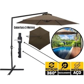 Cobertura: Poliéster Acompanha Base: Sim Haste: 48 mm Acionamento Ombrelone: Manivela Dimensões Ombrelone: 300 cm x 300 cm x 245 cm Giratório: Sim Estrutura: Aço Cor: Marrom Dimensões aproximadas montado (C x L x A): 168 cm x 28 cm x 13 cm