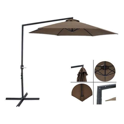 Ombrelone Suspenso Veneza 3 Metros Marrom - Bel 100% Poliéster Haste e varetas em aço Haste 48 mm; varetas de 12mm x 18 mm; comprimento: 52 cm Altura (até o topo): 2,45 m; altura (até o tecido): 1,95 m FPS: 35 Base em X para fixação de contrapeso (contrapeso nao incluso) Contrapeso recomendado: 60 kg. Tambem pode ser parafusado no Chao ao inves de uso de Contrapeso.