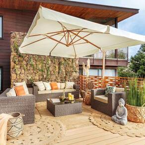 Transforme seu espaco ao ar livre em um oasis de relaxamento com o Ombrelone Lateral Retangular 400x300cm. Com seu design elegante e sofisticado, este ombrelone e perfeito para adicionar sombra e conforto a sua area de patio, jardim ou piscina. A estrutura e feita de aluminio resistente com acabamento em tom de madeira, garantindo durabilidade e resistencia contra as intemperies. Sua forma retangular e cor creme/bege proporcionam uma cobertura ampla e um visual atraente que se adapta a qualquer decoracao ao ar livre.