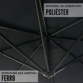 • Cobertura em poliéster • Cobertura de 3,00m de diâmetro / Altura 2,45m • Haste em Aluminio 48mm de diâmetro com manivela • Varetas em ferro • Acompanha base de encaixe em formato de cruz