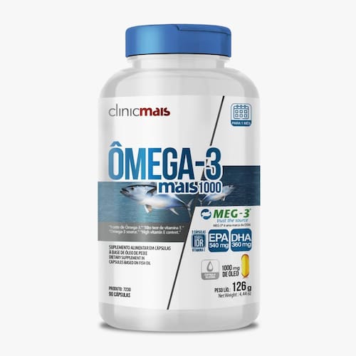 Ômega 3 mais 1000mg clinicmais 90 cápsulas O ômega 3 é um suplemento a base de óleo de peixe, é um produto totalmente natural capaz de proporcionar incríveis benefícios a sua dieta. Especificações: Fonte de ômega-3. Epa - 540mg. Dha - 360mg. Recomendação de uso: Ingerir 2 a 3 cápsulas ao dia. Indicação: Indivíduos com idade = 19 anos. Ingredientes: Óleo de peixe e vitamina e acetato de dl-alfa-tocoferol . Composição da cápsula: gelatina, umectante glicerina. Não contém glúten. Alérgicos: contém derivados de peixes. este produto não é um .não exceder a recomendação diária de consumo indicada na embalagem.mantenha fora do alcance de crianças.a vitamina e é um antioxidante que auxilia na proteção dos danos causados pelos radicais livres. Produto dispensado de registro de acordo com a rdc n 240 de 26/07/2018.