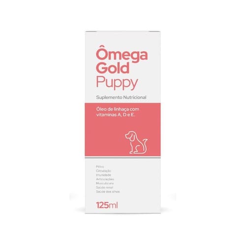 Omega gold puppy - 125 ml ômega gold puppy é um produto específico para filhotes, alimento rico em ômega 3, ômega 6, ômega 9 e alguns ácidos graxos específicos, desenvolvido para complementar a nutrição dos animais em desenvolvimento. Vem enriquecido com vitamina a, d e e, vitaminas essas que complementam ainda mais os benefícios desse excepcional produto. O ômega gold puppy é de fácil aplicação e manuseio, além de um agrado mais que especial para o seu filhote. Modo de usar: