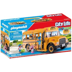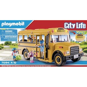 Versão Playmobil School Bus 2022 - Os alunos veem as luzes piscando do ônibus escolar quando ele se aproxima do ponto de ônibus. - As crianças estão de mochila e estão prontas para a viagem à escola. - O sinal de parada se dobra e as portas se abrem, revelando o motorista quando ele recebe as crianças no ônibus. - O ônibus pode acomodar seis estudantes e o motorista.