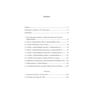 Na vida de oração, a personalidade e o temperamento individuais também têm de ser levados em conta. Sem consciência clara da natureza individual, o esforço de relacionar-se com Deus por meio da prece costuma resultar em angústia, frustração e até em esgotamento mental. Tudo se torna mecânico e o indivíduo tenderá a distrair-se e a sentir-se mais e mais culpado de seus defeitos, em vez de seguir em frente e perceber o caráter inato e até mesmo saudável de muitas de suas tendências. Só assim a oração pode vir a ser "uma conversa familiar de união do homem com Deus" nas palavras de São João Clímaco. Estudiosos do Indicador de Tipo Myers-Briggs (mbti), os autores deste livro decidiram experimentar o célebre sistema de classificação de personalidade em retiros e direções espirituais, em vista de um melhor guiamento das almas individuais. Do sucesso das experiências veio a motivação para escrever Oração e temperamento. O volume oferece uma visão geral da história do temperamento e de sua relação com a vida espiritual desde a medicina hipocrática à psicologia moderna, passando por Cristo e os apóstolos , a que se seguem variadas sugestões práticas, baseadas, por sua vez, num esquema de correspondências entre os quatro tipos fundamentais de temperamento e quatro formas tradicionais de oração: inaciana, agostiniana, franciscana e tomista.