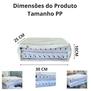 Oraganizador de cobertores e edredom tamanho pp 10x30x25 Cor: branco Transforme seu lar em um oásis de organização e elegância com nosso exclusivo pack organizador, especialmente desenvolvido para acomodar cobertores, edredons, toalhas e travesseiros. Confeccionado com materiais de altíssima qualidade, este organizador oferece durabilidade e resistência, garantindo que seus itens permaneçam protegidos e sempre à mão. Qualidade superior dos materiais Nosso organizador é produzido com tnt de gramatura 100 e a parte plástica com gramatura de 020, um tecido respirável que evita a formação de mofo e odores, mantendo suas roupas de cama sempre frescas e higienizadas. O zíper robusto e o visor transparente facilitam o acesso e a visualização dos itens armazenados, proporcionando praticidade no dia a dia. Versatilidade em cada detalhe Além de armazenar cobertores e edredons, este organizador é perfeito para toalhas, travesseiros e até mesmo roupas fora de estação. Sua estrutura leve e dobrável permite que seja facilmente guardado quando não estiver em uso, otimizando o espaço no seu guarda-roupa ou closet. Benefícios de um ambiente organizado Manter seus itens devidamente organizados não só facilita o acesso, mas também contribui para um ambiente mais harmonioso e livre de bagunça. A organização adequada prolonga a vida útil dos seus pertences e transforma sua casa em um espaço mais agradável e funcional.
