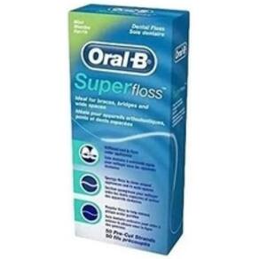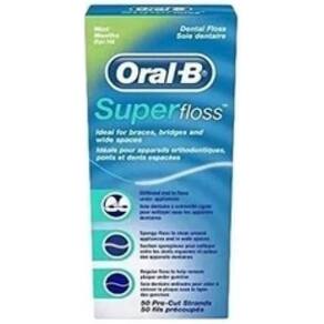 Característicasoral-b Superfloss Mint tem as seguintes características: Ideal para cintas, pontes e também vãos largos; Três fios diferentes em apenas um fio; Permite o uso do fio dental sob aparelhos dentários; Limpa entre espaços amplos e também em torno de aparelhos; Remove a placa sob a gengiva.