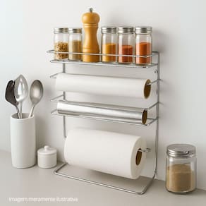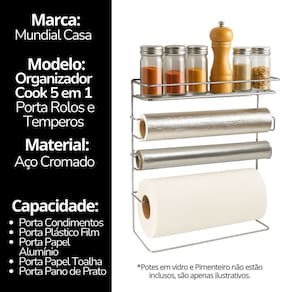 O Organizador 3 Rolos e Porta Tempero Aço Cromado 5 em 1 da Mundial Casa possui encaixe para Papel Toalha, Papel alumínio, Papel Filme, Porta Temperos ou Condimentos e ainda Porta Pano de Prato! Ele é produzido em Aço com acabamento cromado, um acessório indispensável e super funcional para sua cozinha! Basta parafusar e pronto!