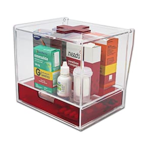 Com um design compacto e versátil, este organizador é perfeito para otimizar o espaço em sua casa ou consultório médico. Sua estrutura em acrílico transparente cristal e vermelho transparente oferece uma visualização clara do conteúdo, tornando mais fácil identificar os medicamentos que você precisa. Além disso, a tampa articulada permite um acesso rápido e conveniente ao compartimento principal, enquanto a gaveta logo abaixo proporciona espaço adicional para armazenar itens menores ou medicamentos de uso frequente.