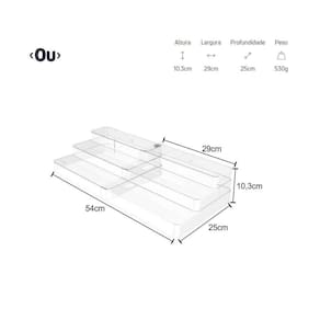 Organizador Armários Temperos 3 Níveis Linha Clear Casa Ou Organizador Multinível Extensível Clear Transparente 3 Andares Casa Ou Detalhes do Produto: O Organizador Multinível Extensível Clear 25 x 29-54 x 10,3cm é o novo padrão de transparência na organização. Organize em níveis e enxergue facilmente o conteúdo, mantendo tudo em ordem. Seu design foi pensado para permitir diversas composições e proporcionar máximo aproveitamento de espaço nos ambientes. Produzido em material resistente o organizador possui alças confortáveis que facilitam na hora do transporte. Na despensa Ou na cozinha, no quarto Ou na lavanderia, a linha clear é indispensável para auxiliar você na organização da sua casa. Cuidados:Este produto é BPA Free, não deve ser levado ao freezer ou ao microondas. Sugere-se higienizar o mesmo com sabão neutro e esponja macia, evitando produtos abrasivos no processo de limpeza. Especificações do Organizador 3 Níveis Multiuso: Cor: Transparente Modelo: 3 niveis extensível Material: Poliestireno Altura Nível 1: 3,5cm / Nível 2: 7cm / Nível 3: 10,3cm Dimensões Totais - Altura: 10,3cm / Largura: 25cm / Comprimento: 29cm (fechado) 54cm (estendido) Imagens ilustrativas.