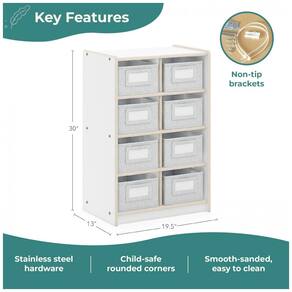 O organizador acompanha oito caixas de tecido resistentes, dimensionadas para encaixar nos nichos, cada uma medindo aproximadamente 20,8cm de largura, 27,2cm de profundidade e 13,5cm de altura. As caixas ajudam a manter peças menores agrupadas e fora de vista, ao mesmo tempo em que permanecem acessíveis para as crianças retirarem e guardarem seus itens com autonomia.?