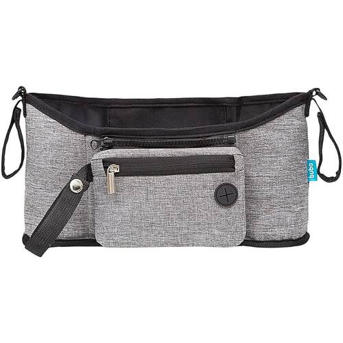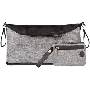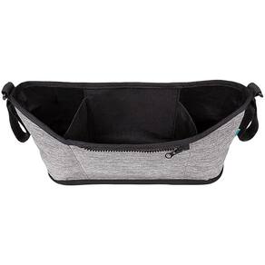 Material de borracha resistente, alças ajustáveis se adaptam à maioria dos carrinhos do bebê, se encaixa nas barras do carrinho, suportes para bebidas que comportam a maioria dos copos e garrafas, bolsa menor removível para usar de forma independente, inclui abertura para cabo de fone de ouvido e lavável na máquina.