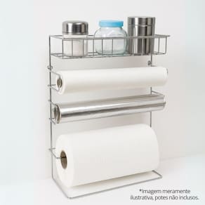Com design funcional e estrutura resistente, o suporte comporta três tipos de rolos (papel toalha, papel alumínio e plástico filme PVC) e ainda conta com uma prateleira superior para armazenar potes de temperos e condimentos com praticidade. A instalação é simples e o produto acompanha parafusos e buchas para fixação na parede, garantindo firmeza e segurança.