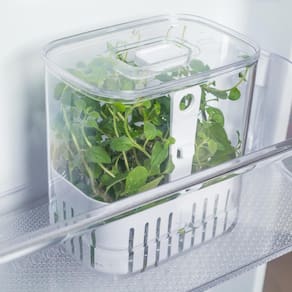 O Organizador de Temperos Clear Fresh 1,5 Litros da OU é um recipiente projetado para prolongar o frescor de ervas e temperos na geladeira através de um sistema de armazenamento com cesto de drenagem e ventilação controlada.