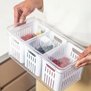 Descrição e Funcionalidades: Este modelo destaca-se pelo seu cesto triplo removível, que permite separar diferentes tipos de alimentos (como frutas, verduras e legumes) em um único recipiente, facilitando a organização e a limpeza. Sistema de Ventilação: A tampa possui respiradouros ajustáveis que controlam a umidade interna, garantindo a conservação ideal para cada item. Drenagem: Os cestos internos evitam que os alimentos fiquem em contato com a água após a lavagem, o que previne o apodrecimento precoce. Design: Sua transparência total permite a visualização rápida do conteúdo, ajudando a evitar o desperdício. Além disso, é empilhável, otimizando o espaço vertical na geladeira.