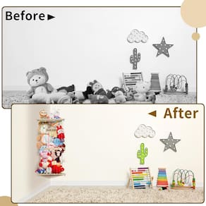 Organizador de armazenamento de animais de pelúcia de canto — Suporte para animais de pelúcia para crianças com comprimento ajustável — Armazenamento de pelúcia de parede DIY para berçário e quarto de jogos — Armazenamento de bichos de pelúcia de grande capacidade: facilmente ajustável até 85 polegadas. Com uma capacidade máxima de 100 litros, é perfeito para guardar brinquedos de pelúcia de vários tamanhos. Libera espaço no chão e na cama dos quartos das crianças, mantendo-os arrumados e espaçosos. Ajuda as crianças a desenvolverem bons hábitos de arrumação. Um ótimo presente para filhas, filhos, para aniversários, chás de bebê e Natal. O armazenamento de brinquedos de pelúcia com altura ajustável e grande capacidade pode acomodar muitos brinquedos, ideal para o quarto de qualquer criança. - Dois métodos de instalação: O armazenamento de bichos de pelúcia oferece duas opções de instalação distintas. A primeira forma é configurada como uma instalação de duas camadas. A parte superior é escavada, permitindo que as crianças se divirtam atirando basquete. Não é apenas uma solução de armazenamento, mas também um entretenimento para crianças. A segunda maneira é uma instalação de camada única. A parte superior pode ser usada para colocar itens como molduras e troféus. Esse design inteligente aumenta o espaço de armazenamento e, ao mesmo tempo, fornece um toque decorativo. - Economiza espaço e é decorativo: projetado para uso em paredes de canto de 90°, o corte triangular de filé garante a segurança de seu filho e pode fazer pleno uso da posição de canto, não ocupa espaço extra, o que economizará muito espaço para você. O armazenamento de bichos de pelúcia vem com uma placa de madeira e cordões de luz LED coloridos (bateria não incluída). As crianças podem fazer você mesmo a placa de identificação e os cordões de luz livremente, exercendo totalmente sua criatividade e criando um ambiente confortável e aconchegante ao mesmo tempo. - Altura ajustável e design de gancho: a prateleira de parede de armazenamento de brinquedos de pelúcia com cordas elásticas coloridas tem altura ajustável. Você pode escolher o local e a altura da instalação de acordo com a altura da criança. Os brinquedos estão ao alcance das crianças para gerenciá-los com facilidade e mobilizar seu entusiasmo por arrumar. O armazenamento de brinquedos tem quatro ganchos para chaves, brinquedos e bolsas para aumentar o armazenamento. Também pode armazenar roupas, brinquedos de bola, raquetes e outros itens. - Alta qualidade e fácil instalação: nosso armazenamento de bichos de pelúcia é feito de madeira natural espessa. Tem uma capacidade máxima de carga de 15 kg. Cada tábua de madeira tem um design padrão exclusivo que é muito popular entre as crianças. O armazenamento de brinquedos de pelúcia está equipado com todo o hardware e um manual de instruções claro, facilitando a instalação. É muito adequado para creches, pré-escolas, salas de jogos, quartos, quartos infantis e salas de estar.
