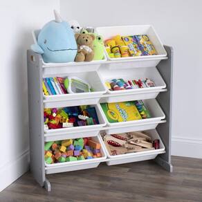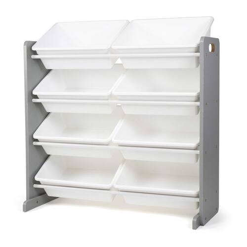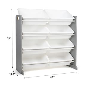 Humble Crew Organizador de brinquedos, 8 caixas de armazenamento grandes, cinza/branco - Caixas de armazenamento removíveis para brincar e limpar facilmente. - Estrutura de construção de madeira robusta reforçada com cavilhas de aço, capacidade de peso de 9 kg por nível. - 8 caixas de armazenamento de plástico durável. Livre de BPA e ftalatos. - Acabamento moderno de madeira cinza com caixas de brinquedos de cor branca. - Tamanho do produto — Organizador: 86" L x 11" D (16" com suportes estabilizadores) x 31" A. Caixas de tamanho grande: 40,6 cm C x 12" L x 6" A - Montagem necessária. Inclui todas as ferragens. Suportes estabilizadores e tiras anti-ponta fornecidos para suporte de segurança adicional. - Ideal para crianças a partir de 3 anos para brincar, ler, fazer artesanato e mais.