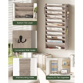 CHOEZON Organizador de arquivos: Simplifique seu espaço de trabalho! O organizador de correio CHOEZON foi projetado para gerenciar habilmente seus documentos e correspondência. Sua estrutura de 10 camadas oferece opções de armazenamento flexíveis adequadas para montagem em mesa e parede. Construído com aglomerado de longa duração e finalizado com um grão de madeira encantador, combina forma e função. Pode ser um item essencial para qualquer escritório, casa ou escola.