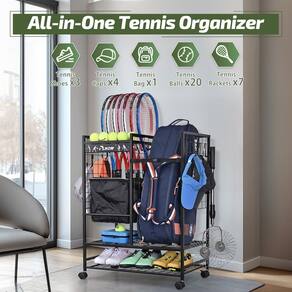 - ?Solução de armazenamento de tênis tudo-em-um? Projetado para armazenar bolsas de tênis, raquetes, bolas, sapatos e acessórios em um só lugar, mantendo tudo organizado e facilmente acessível.