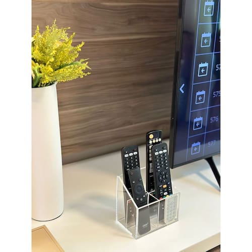 Organize seus controles remotos com praticidade e estilo com este organizador em acrilíco com 4 divisórias, mantenha seus dispositivos eletrônicos sempre a mão e livre de bagunça, facilitando o acesso a organização em sua sala de estar ou escritório.