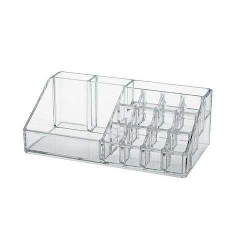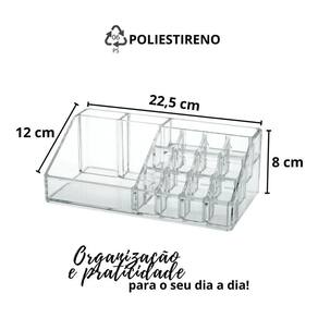 O organizador de maquiagem mais completo que você pode encontrar Nele você poderá armazenar batons, lápis, pinceis, bases, cremes etc em mais de 10 divisórias. É um produto prático e compacto, pois tudo isso poderá ser guardando em um espaço de 22,5 x 12 cm, seja no guarda roupa, gaveta, escrivaninha penteadeira, quarto ou bainheiro. Produzido em poliestireno, material nobre e , de alta resistência durabilidade e qualidade.