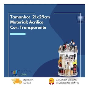 Grande organizador de cosméticos e maquiagem, com esse organizador você pode facilmente obter o que você deseja utilizar no seu dia-a-dia, de forma prática. A caixa de exposição é ajustável multi-level tem 4 bandejas médias, que podem ser fixadas na altura mais baixa ou mais elevada ajustada por 6,7 polegadas, você pode acomodar tipos diferentes de cosméticos e de recipientes. Fácil de montar, desmontar e limpar. Acomoda todas as suas jóias, cosméticos, pincéis de maquiagem, produtos para a pele, batons, unha polonês, delineador e muito mais em recipientes extra grandes, poupa-lhe espaço no balcão e mantem a sua bancada mais organizada. Especificações: Material: Acrílico- 4 Bandejas ajustáveis Espaçamento entre as bandejas: 15cm de largura x Altura ajustável Imagens de Maquiagens e cosméticos meramente ilustrativas Itens INCLUSOS: 1 Organizador de maquiagem desmontável. Marca: Gama Loja