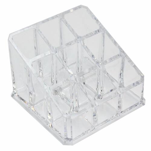 Maquiagem organizada é essencial para quem tem pouco tempo. Organizando a maquiagem, conseguimos usar tudo o que temos, otimizar nosso tempo. Esse organizador é em plástico transparente, bem similar ao acrilico. Tem 9 espaços para batons ou esmaltes. Tamanho:: 9cm larg x 9cm comp x 6,5cm altura Cor: Transparente Material: Acrílico Ean: 7898943567468