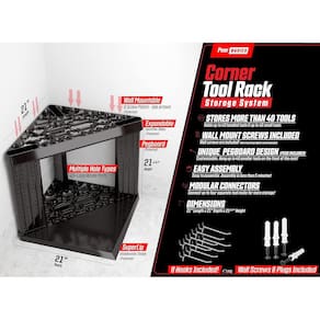 Organizador de Esquina PeerBasics para Herramientas, Organización para Garage, con capacidad para hasta 40 herramientas como palas, escobas, rastrillos, trapeadores, martillos y podadoras. Incluye panel de clavijas para colgar y organizar, montaje en pared y ganchos para herramientas. - ¡Características exclusivas que no encontrarás en ningún otro lugar! Otros organizadores de herramientas suelen caerse debido a su diseño cilíndrico endeble. Hemos invertido muchas horas en construir una estructura súper resistente para mantener el organizador estable, además incluimos tornillos para fijarlo a la pared y evitar que se caiga en la esquina, en tu garage o peor aún, sobre tu auto. - Capacidad para más de 40 herramientas: ningún otro organizador del mercado soporta hasta 40 herramientas grandes y 40 herramientas pequeñas. - Característica única de panel de clavijas: los organizadores de esquina son ideales para herramientas grandes, ¿pero qué pasa con las pequeñas? El diseño patentado de PeerBasics utiliza aún más espacio permitiendo colgar hasta 40 herramientas pequeñas en la parte frontal del organizador, personalizando la distribución a tu gusto. - No requiere herramientas para armar: fácil de montar en menos de 5 minutos, ¡más fácil que nunca para que te organices! - Hemos escuchado tus comentarios, este modelo está construido correctamente: nuestro nuevo diseño hace que el organizador sea más estable y soporte más herramientas. Fabricado en polipropileno resistente a impactos, no se pudre ni oxida.