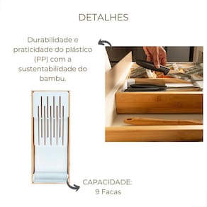 O Organizador De Facas 9 Divisórias Gavetas Cozinha Keep Bambu é feito com bambu, um material 100% renovável, que traz sofisticação para a decoração da sua casa. Seu design modular permite uma harmonia completa com o ambiente, enquanto suas 9 divisórias garantem que suas facas sejam acomodadas de forma segura, preservando o fio e evitando acidentes. Produzido com plástico PP de alta resistência, o organizador oferece durabilidade e praticidade. Além de trazer organização para a sua cozinha, o organizador de facas da Keep possui um design moderno, economiza espaço e oferece praticidade no dia a dia. A marca Keep é conhecida pela qualidade e durabilidade dos seus produtos. Compre agora o Organizador De Facas 9 Divisórias Gavetas Cozinha Keep Bambu e eleve o nível da organização da sua cozinha. Ean: 7908466037697