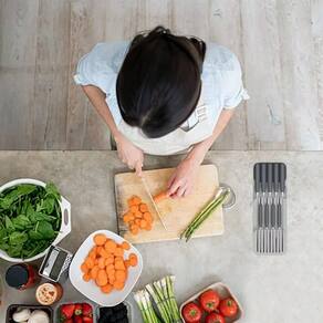 Características do Produto: 1. Feito de material polipropileno de qualidade alimentar 100%, passou o padrão FDA/LFGB 2. Design multicamadas para fácil armazenamento 3. Simples e prático, higiênico e saudável, com base antiderrapante. 4. Cor: Cinza 5. Material: polipropileno 6. Capacidade: 18 lugares ideal para 9 facas 7. Função: Armazenamento na cozinha