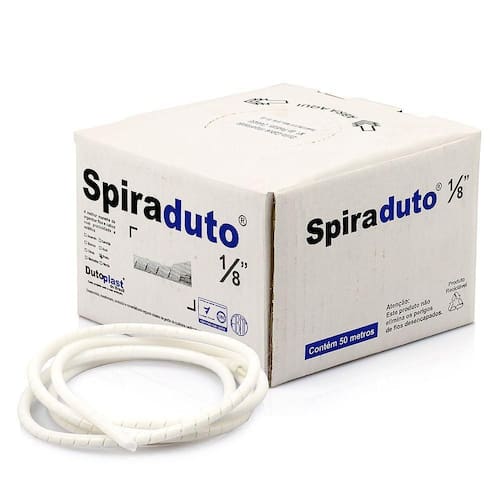 Organizador De Fios E Cabos Spiraduto 1/8 Branco - 4 Mt Proteja e organize seus cabos com facilidade usando o Spiraduto de 1/8. Além de proteger, ele possibilita a saída do cabeamento em qualquer ponto do chicote. Ele permite várias composições de layout e uma isolação mais segura ao seu sistema de cabeamento.
