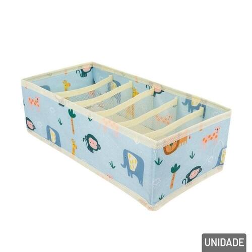 Organizador de Gaveta TNT 32,5x16,5cm 6 Divis Transforme a organização das suas gavetas em algo prático e divertido com o Organizador de Gavetas em TNT com 6 Divisórias, agora com uma fofa estampa de animais que dá um toque de charme e alegria ao seu dia a dia.\nCom medidas de 32,5cm de comprimento x 16,5cm de largura, esse organizador é ideal para manter itens como meias, calcinhas, cuecas, gravatas, lenços ou acessórios pequenos bem acomodados, separados e sempre à vista. Suas 6 divisórias internas ajudam a manter tudo em ordem, facilitando a rotina e otimizando o espaço das gavetas.\nEspecificações:\nMarca : TINGS\nTipo de material : TNT\nCores ou Estampa : Colorido\nDimensões do Produto : 10 X 32,5 X 16,5 CM\nDimensões da Embalagem : 47 X 10 X 1 CM\nPeso Bruto (Gramas) : 0.080