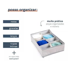 Organizador de Gavetas com 8 Divisórias Multiuso Pratico Organizador de Gaveta com 8 Divisórias - Prático e Compacto O Organizador de Gaveta com 8 Divisórias é a solução perfeita para manter suas roupas íntimas organizadas e sua gaveta mais bonita e funcional. Ele facilita a organização, permitindo que você encontre suas peças rapidamente, sem bagunça. Com laterais mais resistentes, pode ser empilhado quando necessário, otimizando ainda mais o espaço. Quando não estiver em uso, o organizador é dobrável, tornando-o fácil de guardar e armazenar. Benefícios: -organiza suas roupas íntimas de forma prática e eficiente -design dobrável, facilitando o armazenamento quando não estiver em uso -laterais resistentes para maior durabilidade -pode ser empilhado para otimizar o espaço em gavetas ou armários -deixa a gaveta mais bonita e visualmente arrumada Especificações: -material: TNT -medidas: -comprimento: 32cm -largura: 24cm -altura: 12cm -modelo: 8 Divisórias -cor enviada conforme disponibilidade Itens Enviados: -01 Organizador de Gaveta com 8 Divisórias Importante: -cor do produto enviada conforme disponibilidade em . Na Loja Compre Já Fácil, oferecemos uma experiência de compra simples e rápida, com produtos de alta qualidade e preços irresistíveis. Não perca tempo, visite nossa loja e garanta o seu Marca: Não Informado