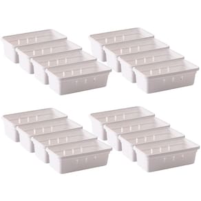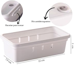 Conjunto com 16 unidades. Organizador de gavetas e talheres plástico 15,0 x 7,9 x 4,5 cm. Possuem encaixes com clique que realmente prendem uma peça na outra. Podem ser reorganizados conforme a sua necessidade. Todas as peças contam ainda com pés antiderrapantes evitando que deslizem com o movimento da gaveta. São perfeitos para organizar talheres, material de escritório, ferramentas, material de costura, maquiagens e todas aquelas bugigangas que ficam misturadas nas gavetas. Material: polipropileno Comprimento: 15,0 cm / Largura: 7,9 cm / Altura: 5 cm