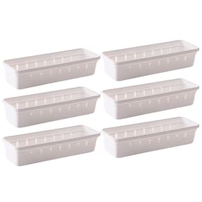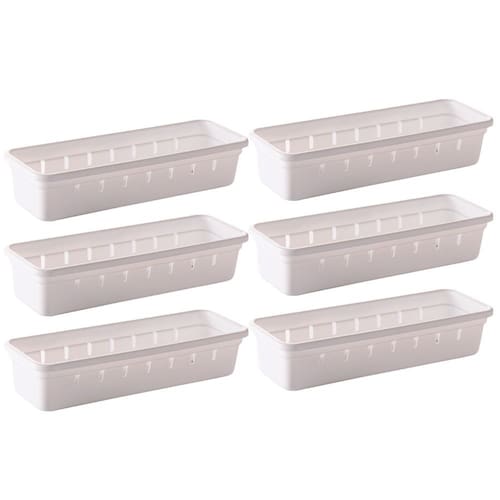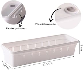 Conjunto com 6 unidades. Organizador de gavetas e talheres plástico 22,5 x 7,9 x 4,5 cm. Possuem encaixes com clique que realmente prendem uma peça na outra. Podem ser reorganizados conforme a sua necessidade. Todas as peças contam ainda com pés antiderrapantes evitando que deslizem com o movimento da gaveta. São perfeitos para organizar talheres, material de escritório, ferramentas, material de costura, maquiagens e todas aquelas bugigangas que ficam misturadas nas gavetas. Material: polipropileno Comprimento: 22,5 cm / Largura: 7,9 cm / Altura: 5 cm