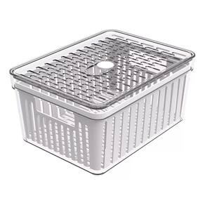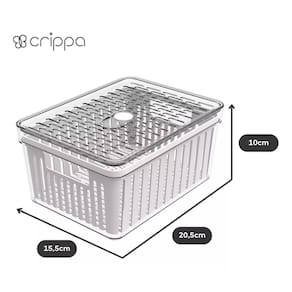 Organizador de geladeira pequenho frutas legumes com cesto ========== sobre o produto ========== O organizador de geladeira pequeno frutas legumes com cesto é a solução ideal para manter seus alimentos frescos e organizados por mais tempo. Com um design inteligente, ele conta com um cesto removível que permite melhor circulação de ar, evitando o acúmulo de umidade e prolongando a vida útil de frutas, legumes e verduras. Feito em plástico transparente de alta qualidade, ele facilita a visualização do conteúdo, ajudando a otimizar o espaço da geladeira e mantendo tudo ao seu alcance de forma prática e higiênica. Este organizador é essencial para quem busca eficiência na cozinha e quer garantir mais frescor aos alimentos. ========== especificações ========== Cesto removível, que facilita a ventilação e evita o acúmulo de umidade. Ideal para armazenar frutas, legumes e verduras com segurança. Material plástico transparente de alta durabilidade, fácil de limpar. Design compacto e prático, otimiza o espaço interno da geladeira. ========== ficha técnica ========== Medidas: 20,5 x 15,5 x 10cm Material: poliestireno ps + polipropileno pp Marca: crippa : 3 meses Estamos online para quaisquer dúvidas, Agradecemos e aguardamos o seu pedido. P: o cesto é removível para facilitar a limpeza R: sim, o cesto é removível, facilitando a limpeza e ventilação dos alimentos. P: posso armazenar outros tipos de alimentos além de frutas e legumes R: sim, o organizador é versátil e pode ser para diversos alimentos, como queijos, frios e embutidos. P: é seguro para contato com alimentos R: sim, o material plástico é seguro para armazenar alimentos e fácil de higienizar. P: o produto é novo ou